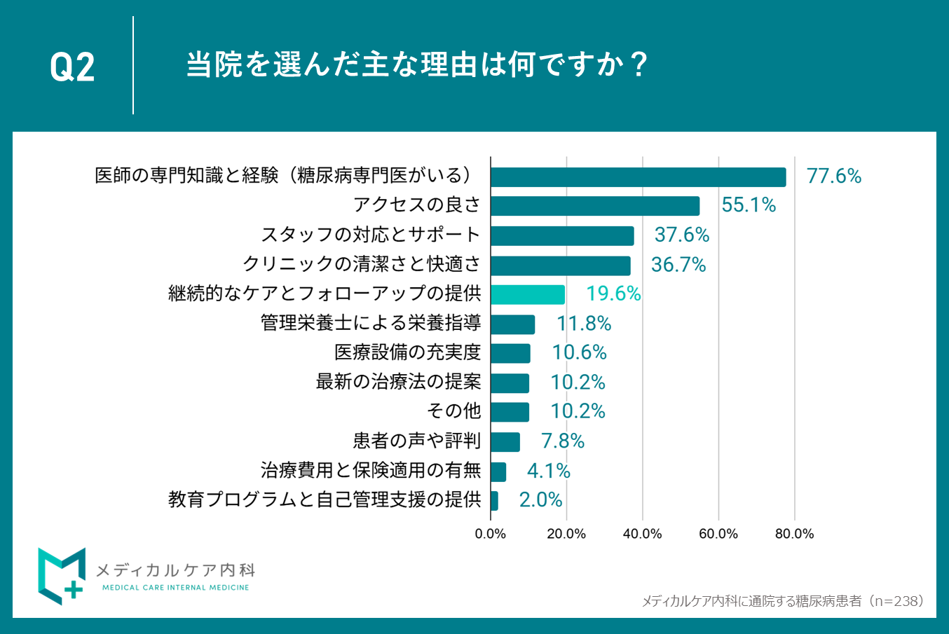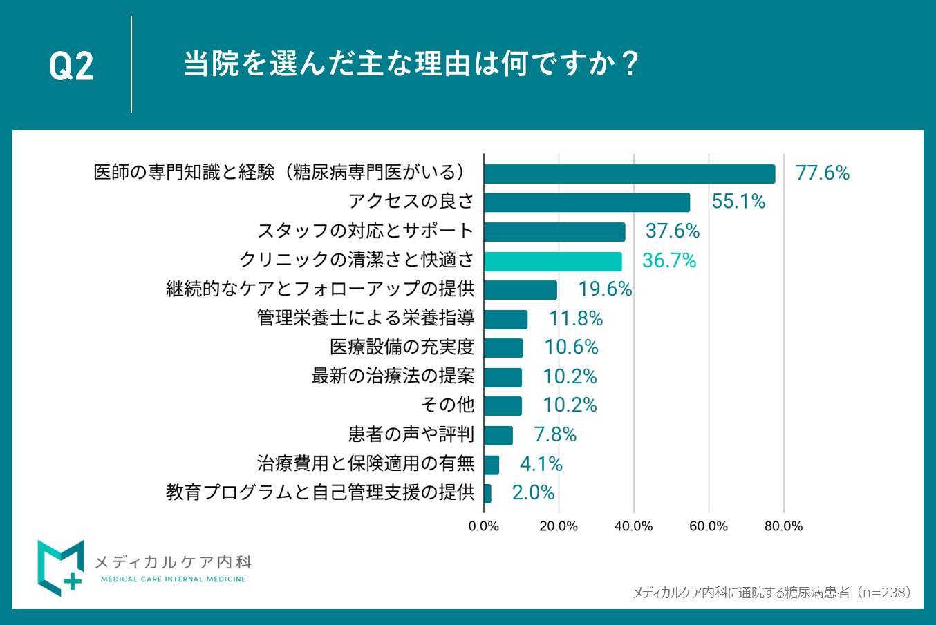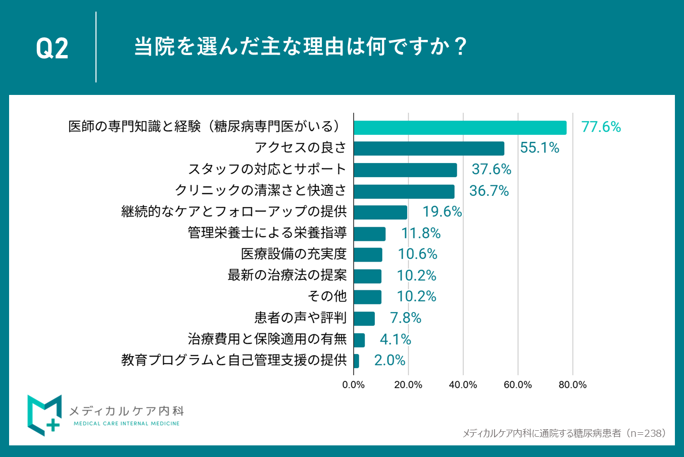 次に多かった理由は「アクセスの良さ」(55.1%)。糖尿病治療は定期的な通院が前提となるため、立地の利便性は治療継続の大きな要素です。