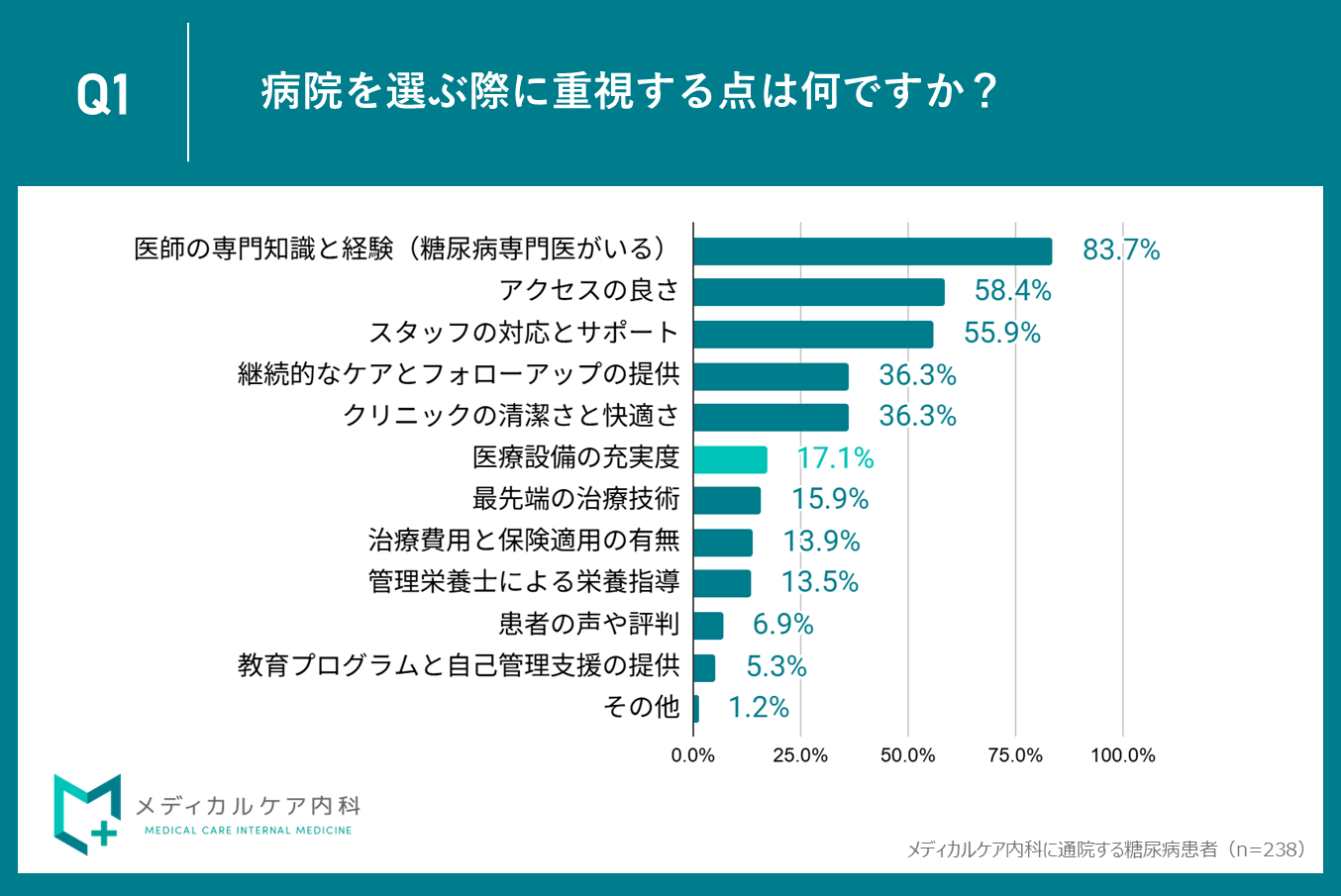 第5位には「医療設備の充実度」(17.1%)が挙がりました。糖尿病治療は血糖値測定や合併症チェックなど継続的な検査が欠かせず、設備の信頼性が患者に安心を与えることが推測されます。