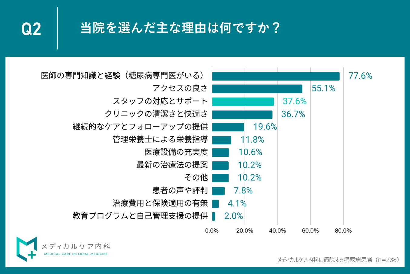 3位には「スタッフの対応とサポート」(37.6%)がランクイン。糖尿病治療では、医師だけでなく管理栄養士・看護師とのチーム医療が欠かせません。