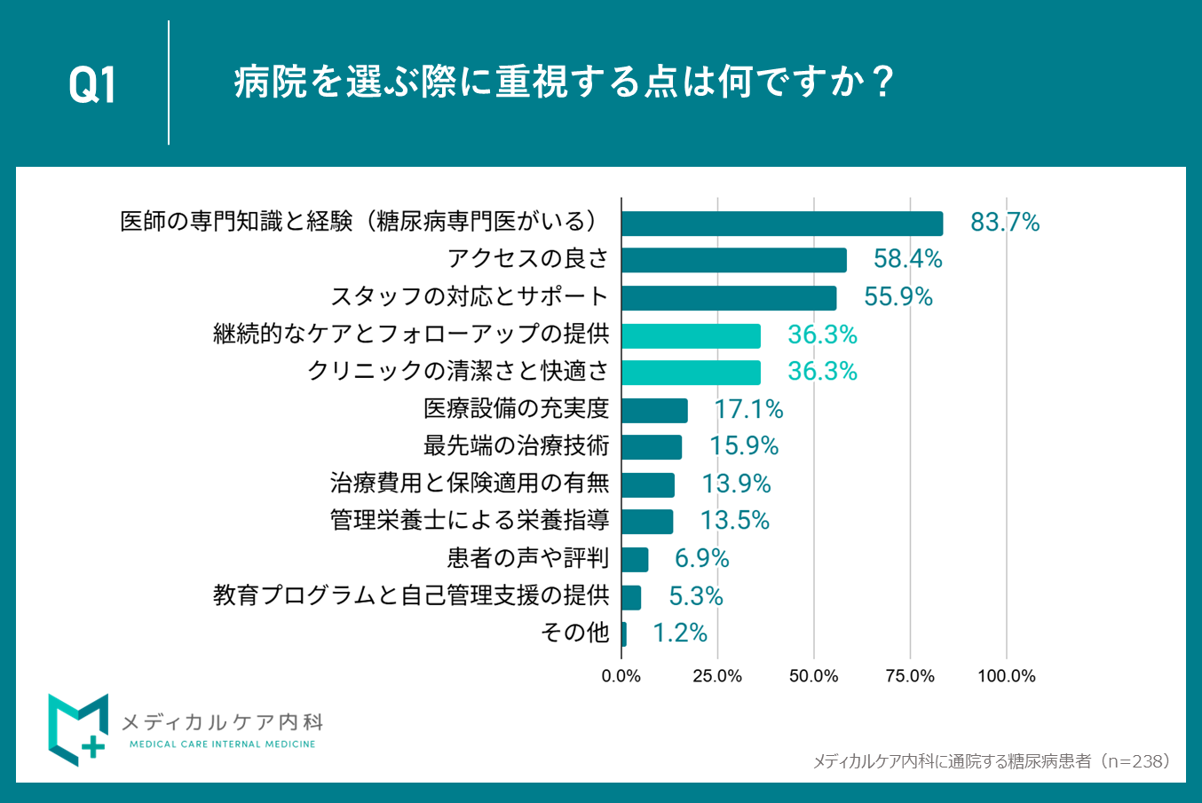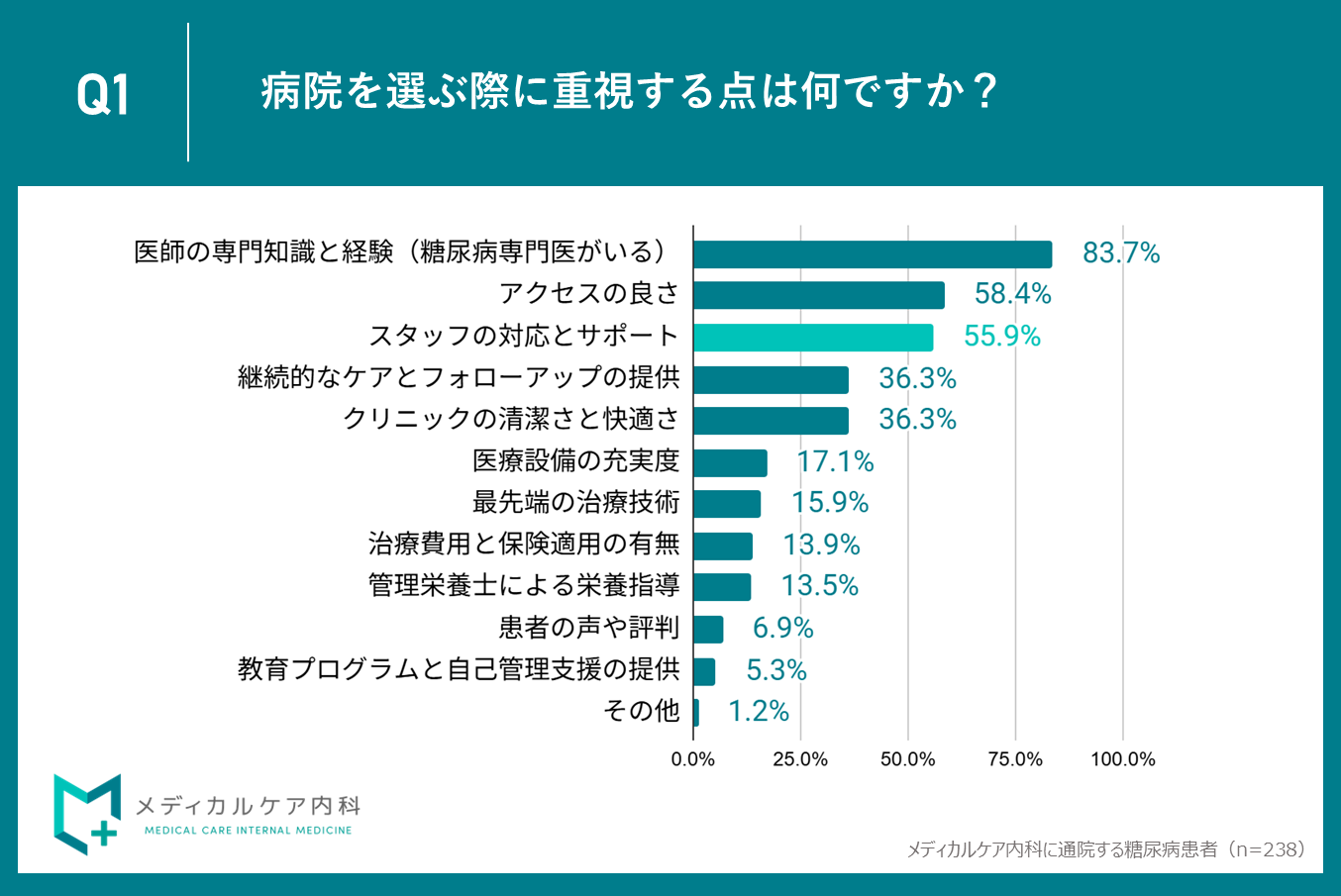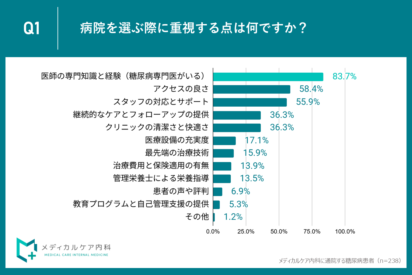 メディカルケア内科(所在地:名古屋市名東区、院長:竹藤 聖子)は、当院に通院する糖尿病患者238名を対象に、「病院選びで重視するポイント」に関する意識調査を実施しました。