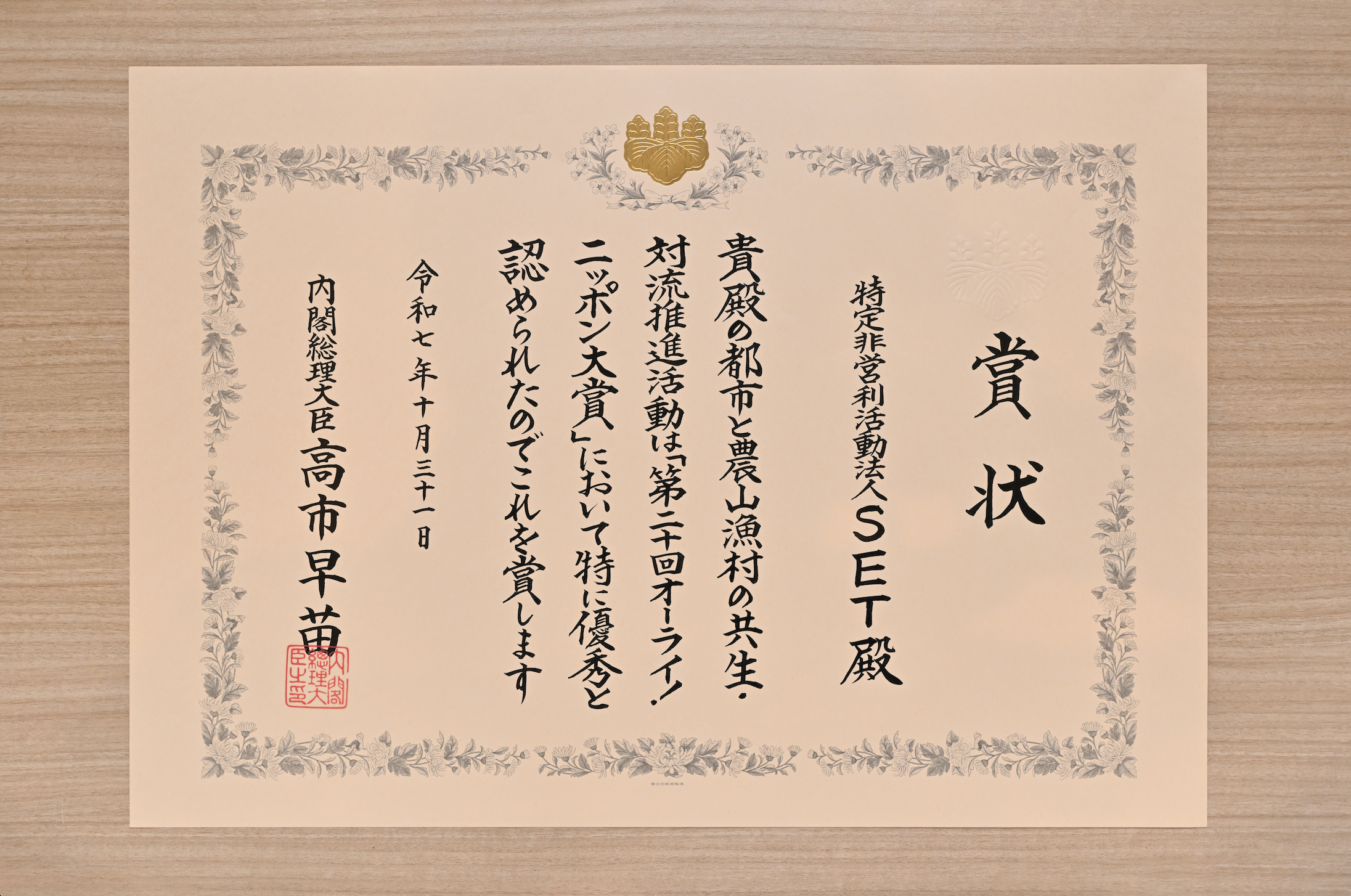 このたび、認定NPO法人SET(本部:岩手県陸前高田市、理事長:三井俊介)は、「第20回オーライ!ニッポン大賞」(主催:(一財)都市農山漁村交流活性化機構(まちむら交流きこう))において、内閣総理大臣賞を受賞いたしました。
