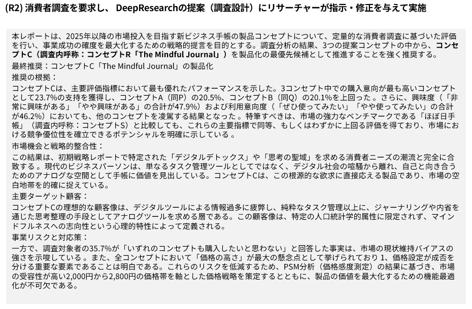 (R2) 消費者調査を要求し、 DeepResearchの提案(調査設計)にリサーチャーが指示・修正を与えて実施