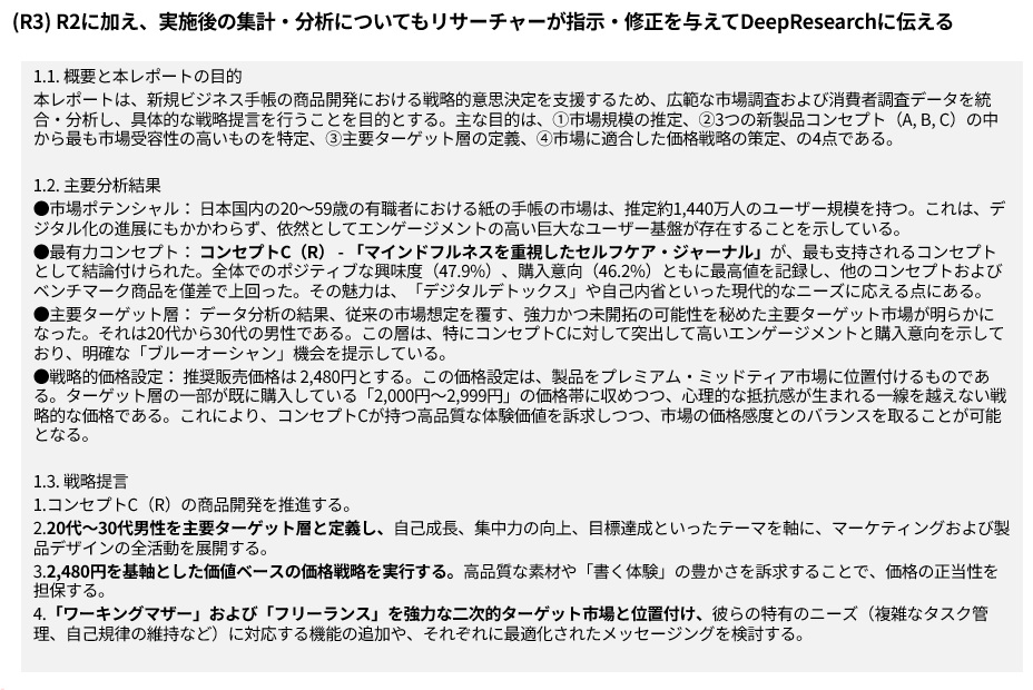 (R3) R2に加え、実施後の集計・分析についてもリサーチャーが指示・修正を与えてDeepResearchに伝える