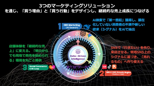 当社が提供する3つのマーケティングソリューションの連携図。 新サービス「GEO Marketing(AI検索対策)」で獲得した認知や顧客シグナルを、SNS集客(O2O)やEC展開(Social Commerce)へシームレスに接続し、データドリブンな売上成長サイクルを構築します。