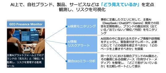 主要AIにおける自社ブランドの表示状況を定点観測し、誤情報やネガティブ情報を検知する「リスクアラート」や、競合他社との露出差を分析する「ミラー分析」機能を提供します。