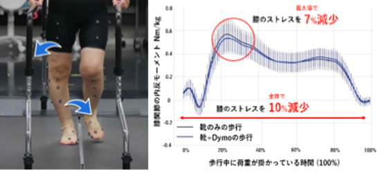 埼玉県立大学 保健医療福祉学部 理学療法学科 村田健児准教授より歩行時の膝関節への負担を軽減する 「Dymo(R) Shape」採用のインソール は、靴に装着するだけで、膝の内反モーメントのピーク値を 約7%低減 し、従来のアーチサポートよりも高い効果を発揮します。 さらに、2足歩行をする人間にとって、歩いている際に膝に加わる力を 約10%低下させることが可能です。
