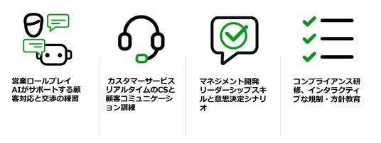 営業ロールプレイ、クレーム対応、1on1マネジメント、コンプライアンス判断など、現場で起きる会話シーンをAIとリアルタイムで対話しながら実践できます。