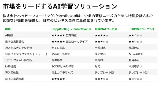 株式会社ハッピフィーリング(本社:埼玉県、代表:望月綾子)は、企業研修を劇的に進化させる次世代AIラーニングソリューションを本日より正式提供いたします。本ソリューションは、世界150以上の政府機関・国際機関・グローバル企業で採用されてきた教育AI「Parrotbox.ai」を日本企業向けにローカライズしたものであり、従来の研修では不可能だった“リアルタイム対話型の高度な実践学習”をあらゆる業界に提供します。