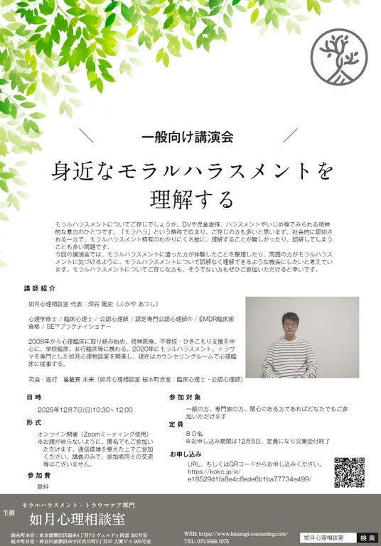 臨床心理士・公認心理師がモラルハラスメントとトラウマケアを専門としたカウンセリングを提供する如月心理相談室は、2025年12月7日(日)に一般向け講演会を開催します。