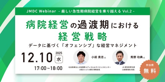 株式会社JMDC(本社:東京都港区、 代表取締役:野口亮、URL:https://www.jmdc.co.jp/)は、オンラインセミナー【厳しい急性期病院経営を乗り越える Vol.2】病院経営の過渡期における経営戦略 ~データに基づく「オフェンシブ」な経営マネジメント~を2025年12月10日(水)に開催します。