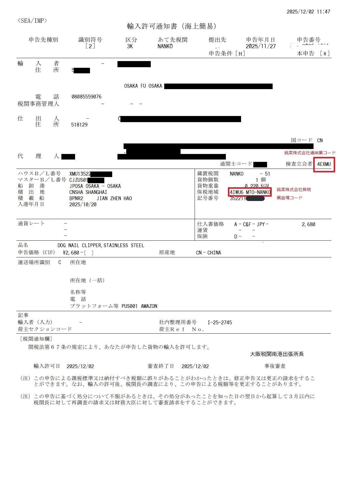 新制度では、貨物情報と通販プラットフォーム情報を事前に精度高く紐付けたうえで、税番・税率等の簡略申告を行う必要があります。当社では独自のデータクレンジング機能とNACCS連携機能を用いることで、海上小包に特有の大量・多品目データを短時間で処理し、2025年12月2日付の円滑な輸入許可取得を実現しています。