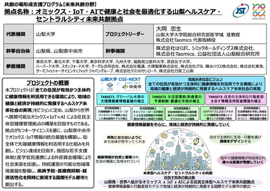 山梨大学発ベンチャーの株式会社Taomics(代表取締役:大岡 忠生)は、国立大学法人山梨大学を代表機関、株式会社Taomicsを幹事機関とする産官学連携プロジェクト「オミックス・IoT・AIで健康と社会を最適化する 山梨ヘルスケア・セントラルシティ未来共創拠点」が、国立研究開発法人科学技術振興機構(JST)の「共創の場形成支援プログラム(COI-NEXT)未来共創分野 (フェーズ1)」に採択されたことをお知らせします。