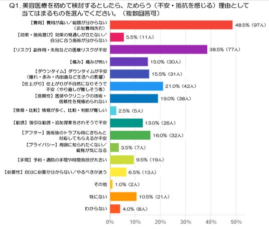 Q1.美容医療を初めて検討するとしたら、ためらう(不安・抵抗を感じる)理由として当てはまるものを選んでください。(複数選択可:注1)