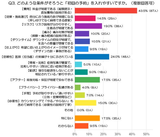 - さらに、「【ダウンタイム】ダウンタイムの目安が明確で、生活への影響が想像できる」は10.5%(21人)、「【痛み】痛み対策が明確(麻酔・痛み軽減の説明がある)」は10.0%(20人)、「【仕上がり】希望に近い仕上がりのイメージが持てる(デザイン方針・事例がある)」は9.5%(19人)でした。痛みの程度や施術後の過ごし方、どのような見た目になるのかが具体的に想像できるほど、初回予約に対する不安はやわらぎやすいといえそうです。受けた後のイメージをどれだけ持てるかも、予約のしやすさに関わっていることがうかがえます。