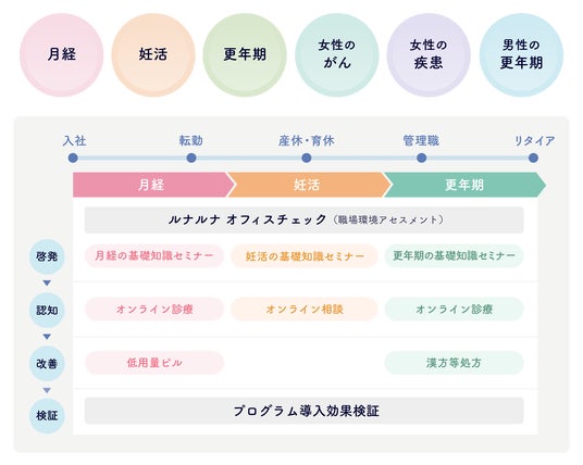 オンライン診療サービス「ルナルナ オンライン診療」を活用し、企業で働く従業員の健康課題改善から効果検証までを一気通貫でサポートする法人向けサービス。女性向けには、月経やPMSの症状から、妊娠や不妊、更年期症状に関するセミナーや産婦人科医への相談、男性向けには、男性更年期に関するセミナーや泌尿器科医への相談の機会を提供しています。