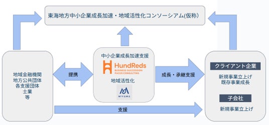株式会社HundRedsの事業承継・中小企業成長加速支援のノウハウと、株式会社MIYAMAの地域創生の実業を掛け合わせ、経営戦略立案、後継者育成、組織最適化、新規事業立上げから伴走まで、グループ横断型の実行支援サービスを提供し、一貫したサービスで地域企業の様々なライフステージに応じた継続的支援の枠組みを構築し提供します。
