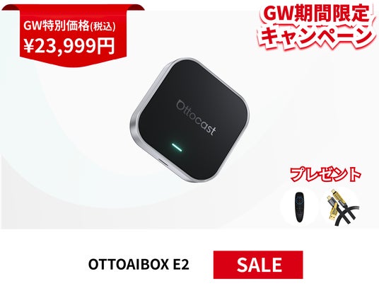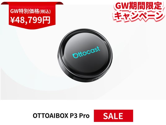 ゴールデンウィーク本番期間に合わせ、主力商品を中心に特別価格(特設ページ:https://ottocast.jp/pages/gw-sale-2026)を実施。CES2026受賞のフラッグシップモデル「OTTOAIBOX P3 Pro」をはじめ、ワイヤレスアダプターシリーズが期間限定価格で提供します。