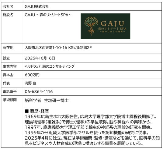 GAJU株式会社(所在地:大阪市北区西天満、代表取締役:河野 豊)は、「都会に森をつくる」をコンセプトにしたドライヘッドスパ専門サロン「GAJU 森のリトリートSPA」を、2026年1月30(金)にオープンいたします。GAJUは、忙しい日常を送る現代人が、短時間でも心身をリセットできる場所として、頭部を中心としたドライヘッドスパを通じ、深いリラクゼーションの時間を提供します。