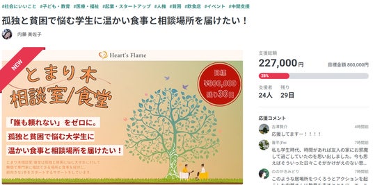 一般社団法人Heart's Flame(本社:東京都新宿区、代表理事:内藤美佐子)は、孤独や経済的困難、精神的な生きづらさを抱える大学生を支援するサービス「とまり木相談室/食堂」の継続・拡大を目的としたクラウドファンディングを2026年1月15日よりReadyForにて開始しました。プロジェクト掲載URLはこちらをご覧ください。