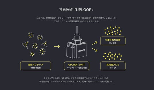 中核となる技術は、溶融塩分野の権威であり共同創業者でもある東北大学・朱鴻民教授が開発した「UPLOOP」(特許出願中)を採用し、アルミニウムをはじめとする重要資源のリサイクルを推進しています。
