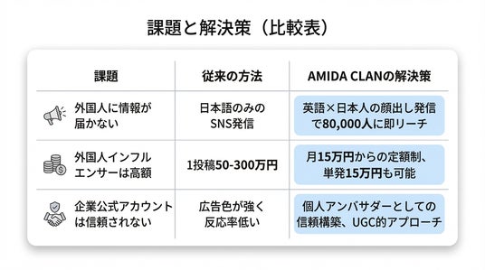 AMIDA CLANは、日本人が外国人目線で英語発信する「アンバサダー型SNS運用」という新モデルで、この課題を解決する。代表の苅部氏は国内外で複数事業を展開する実業家で、10年以上の海外生活で培った「外から見た日本の価値」と、海外SNSフォロワー80,000人超のネットワークを活用し、訪日外国人に直接リーチする即効性の高い集客支援を提供する。