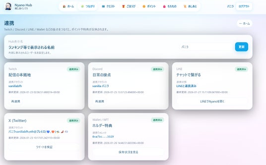 Nyano Hubは、こうした課題を「入口の統合」と「行動の設計」によって解決することを目指します。重要なのは、特定の場所だけが正解になる世界ではなく、“どこで応援しても共通価値となる”状態をつくることです。Twitchでの視聴、Discordでの参加、Xでの拡散、LINEでの交流、Walletを通じた保有――それぞれの応援をクエストとして整理し、親密度やポイントとして可視化し、条件達成で特典が解放される。この一連のループを、迷わず回せる推し活体験としてプラットフォームに実装します。