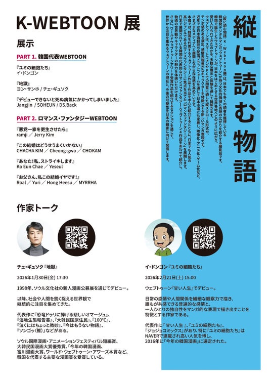開幕日の1月30日には、チェ・ギュソク作家を迎えたトークショーを含むオープニングイベントを開催します。チェ・ギュソク作家は『地獄』、『ソンゴッ(錐)』など、社会的メッセージを反映した作品で知られ、韓国ウェブトゥーンの叙事的な深みと現実性を体現してきた代表的なクリエイターです。