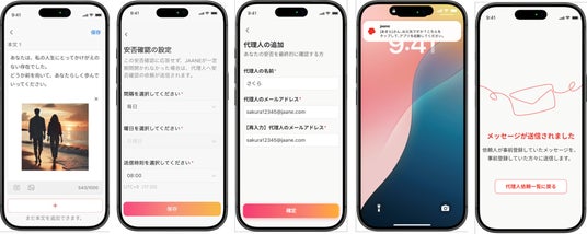 また、『JAANE』は、「メッセージ機能」の他、人生でやってみたいことを登録する「バケツリスト機能」を備えており、人生の有限性を意識することで、生き方を見つめ直し、行動を起こすきっかけとなる、“終活”ならぬ唯一無二の"生き活支援"サービスです。