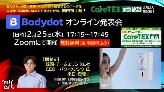 Mirart株式会社(本社:東京都中央区、代表取締役:中野 峻輔、以下「当社」)は、韓国で多数のフィットネスクラブや健康施設に導入されている次世代AI体型分析機 “Bodydot” の日本における正規販売・サービス提供を開始いたします。