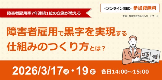障害者の就労支援を展開する株式会社ゼネラルパートナーズ(本社:東京都千代田区、代表取締役社長:進藤均)は、2026年3月17日(火)・19日(木)に「障害者雇用の黒字化」をテーマとしたオンラインセミナーを開催します。