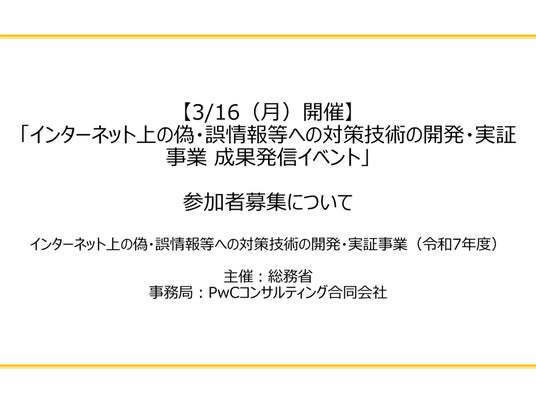 PwCコンサルティング合同会社は、総務省からの委託を受け、「インターネット上の偽・誤情報等への対策技術の開発・実証事業(令和7年度)」の事務局運営を担当しており、このたびイベントを開催します。
