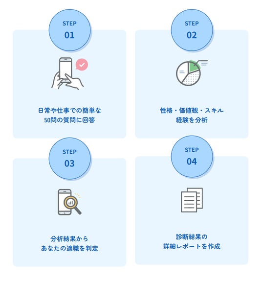 一方で、「自分の性格タイプは分かったが、それが具体的にどの仕事に活きるのか分からない」という“診断迷子”の声も多く聞かれます。当社は、2万人以上の転職成功を支援してきたプロの知見と性格統計学を掛け合わせ、わずか10分・約50問の回答で、個人の本質的な強みと最も輝ける職場環境を導き出す『適職診断』を開発いたしました。