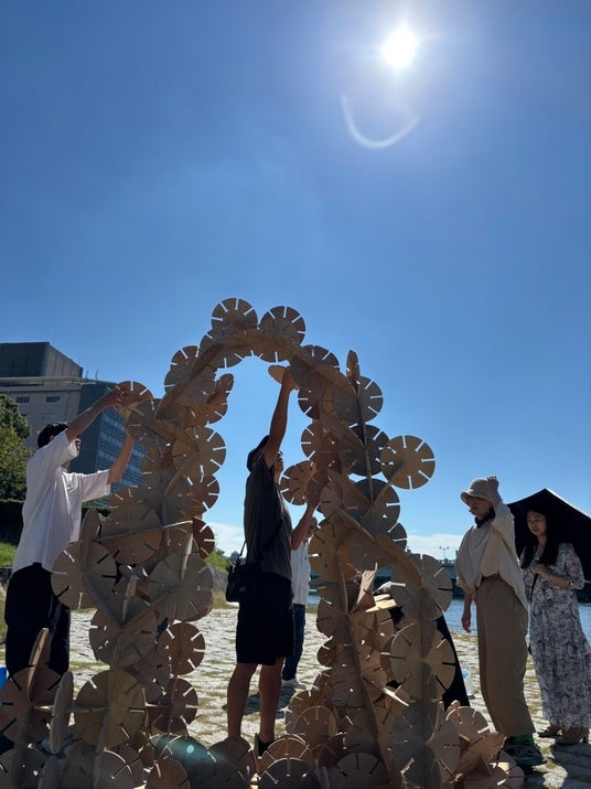 《Re:Arch Hiroshima》は、被爆樹木(広島市より譲渡)と広島県産材、リサイクル材から生まれた円盤型のアートブロックを使い、原爆慰霊碑のアーチ形状をモチーフに、来場者とともに“平和のアーチ”を再構築していく参加型アートプロジェクトです。