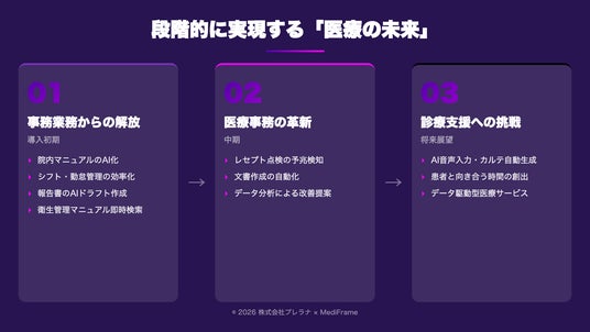 株式会社プレラナ(本社:大阪市北区、代表取締役:市川知樹、以下「プレラナ」)は、医療業界に精通したコンサルティング企業・MediFrame(メディフレーム)と協業し、医療機関特化型のAI導入支援サービスを2026年3月より共同で提供開始いたします。
