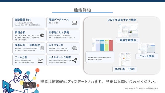 - レポート自動生成: 感情の変化とトークスクリプトを紐付けた要約レポートを作成し、商談内容の把握をスピーディーに行えます 。