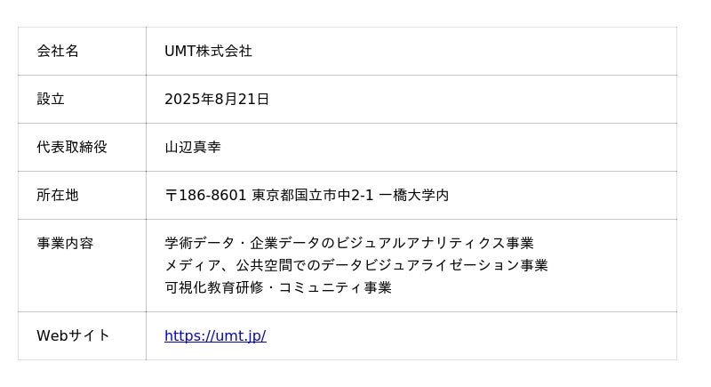 UMT株式会社は、数値の羅列から意味を見出し、複雑な関係性から洞察を導くデータビジュアライゼーション企業です。データと人をつなぐ架け橋として新たな発見へと導き価値を創造するべく、Visual Data Analytics(大規模データの前処理から可視化までを一貫して行うインタラクティブな探索ツールの開発)、Data Visualization(デジタルサイネージやWebアプリケーションなどコミュニケーションに特化したデータビジュアライズのデザイン・コンテンツ開発)、Education & Community(AI・データサイエンス・デザインの融合から価値を創出し、サステイナビリティをはじめとする社会課題に取り組むための教育支援・情報発信・コミュニティ運営)の3領域で事業を展開しています。