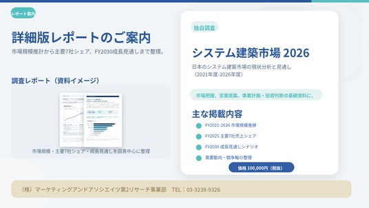株式会社マーケティングアンドアソシェイツ(東京都千代田区)は、関係各所へのヒアリングと公開情報をもとに、日本のシステム建築市場に関する独自調査を実施し、その結果をまとめた『システム建築市場 2026~日本のシステム建築市場の現状分析と見通し(2021年度-2026年度)~』を2026年4月13日に発行致します。あわせてこのたび、報道関係者向けに主要ポイントを整理したメディア向けサマリーを公開しました。サマリーは本リリースページ内でご覧いただけるほか、PDF資料としてダウンロードいただけます。