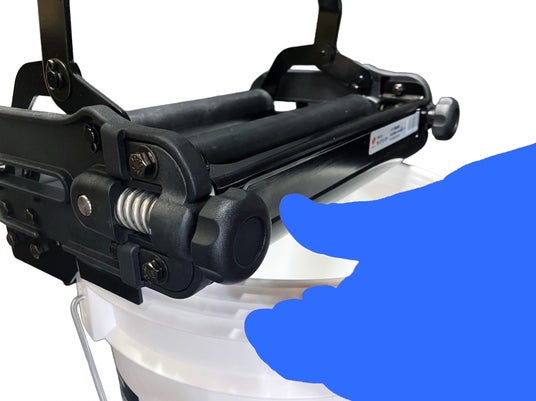 1:業務用樹脂缶に簡単装着スチール缶専用だったモップ絞り器を、樹脂缶に対応させる革新的なアタッチメント設計です。ワックス缶や剥離剤の樹脂缶にスライドさせて差し込み、フックを引っ掛けるだけで簡単に固定ができます。