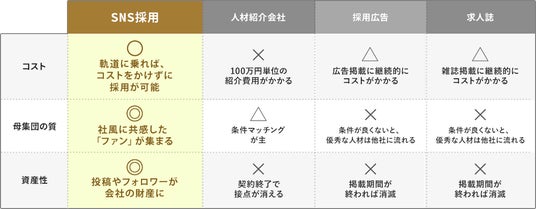 SNS採用は、従来の採用手法に比べて圧倒的にコストパフォーマンスに優れています。