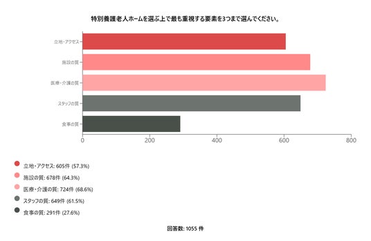 これらの結果は、これからの特養において、「どのようなケアを提供するか」だけでなく、「どのような環境で暮らしていただくか」が、施設選びの重要な判断基準になっていることがうかがえます。