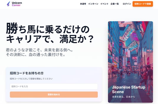 完全成果報酬型・審査制のトップタレント特化型新卒採用プラットフォーム「Unicorn Career」のランディングページ