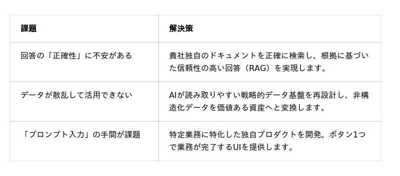 - 「攻めのデータ基盤」:AIが常に最新情報を参照できるようなデータの収集・加工・蓄積のパイプラインを構築可能。
