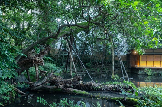 一方、2018年には庭園内に佇んでいた樹齢150年余の春楡(ハルニレ)が、自身の重みに耐えきれず倒木しました。この春楡は、庭園内の子福稲荷神社の御神木のような存在として、長年浮月楼を見守ってきた象徴的な樹です。