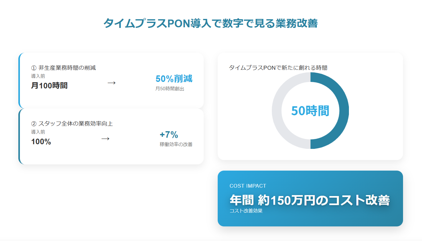 ツールを導入して終わらせないのが「タイムプラスPON」のこだわりです。弊社では、単なるシステム提供に留まらず、以下をパッケージとして展開します。