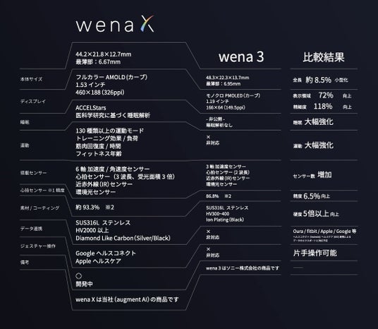 さらに、wena Xは完全新規設計により世界最小サイズ※1を実現。機能を強化しながら、前モデルであるwena 3※6比で全長8.5%の小型化を達成しました。