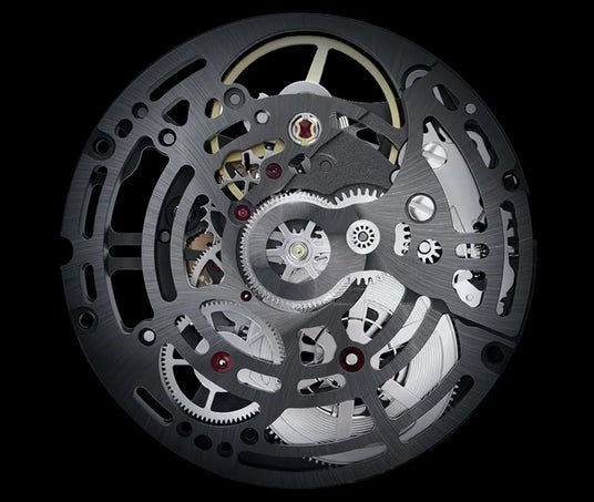 本モデルには、極めて稀少なスイス製新型機械式ムーブメント SELLITA SW200-2 S b Power+ を採用。最大の特徴は、8振動(4Hz)による滑らかな針の動きと、金曜の夜から月曜の朝まで動き続ける65時間のパワーリザーブを両立している点にあります。さらに、スケルトナイズされた構造と、D2装飾※16・ルテニウムアンスラサイトめっきにより、精緻な機構美を際立たせます。