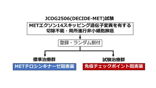 こうした臨床経験を踏まえ、この遺伝子の変化がある肺がんに対して、どの治療を最初に行うのが最もよいのかを明らかにするため、METチロシンキナーゼ阻害薬と免疫チェックポイント阻害薬を比較する第III相無作為化比較試験(複数の治療法を公平に比較するための臨床試験)であるJCOG(注5)2506(DECIDE-MET試験)を計画しました。
