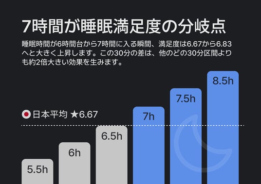 - 睡眠時間が7時間を超えると、満足度は日本人全体平均(6.67点)を上回る