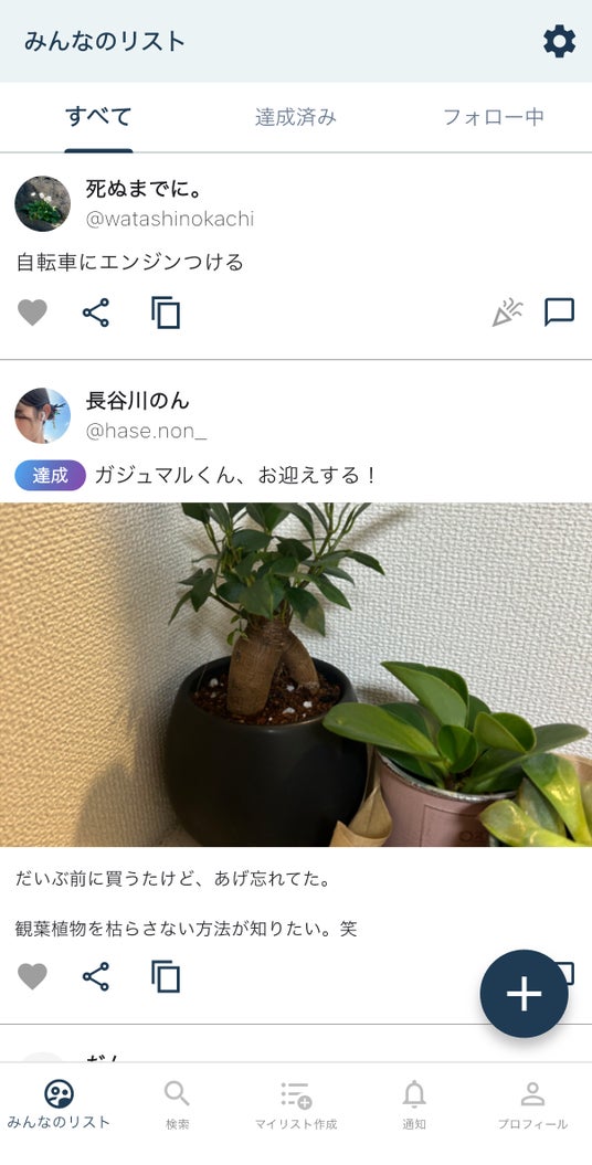 他のユーザーと共有・達成を祝い合えるバケットリストSNSアプリです。