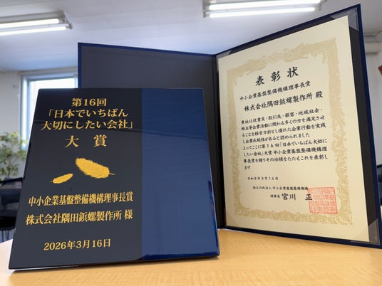 ねじの専門商社として販売・品質管理を担う株式会社 隅田鋲螺製作所(本社:大阪府東大阪市、代表取締役:隅田 貴昭)は、人を大切にする経営学会が主催する第16回「日本でいちばん大切にしたい会社」大賞において、「中小企業基盤整備機構理事長賞」を受賞いたしました。2026年3月16日、都内にて開催された表彰式に出席いたしましたことをご報告いたします。
